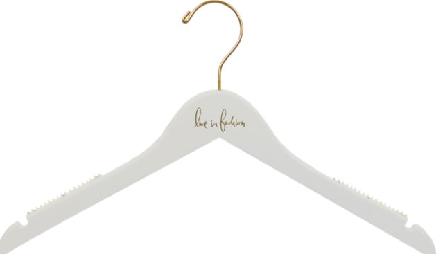 17" X 7/16" White glossy Flat wood top hanger, brass bent end hook, 2.5" Rubber strip. Printed gold ink one side.