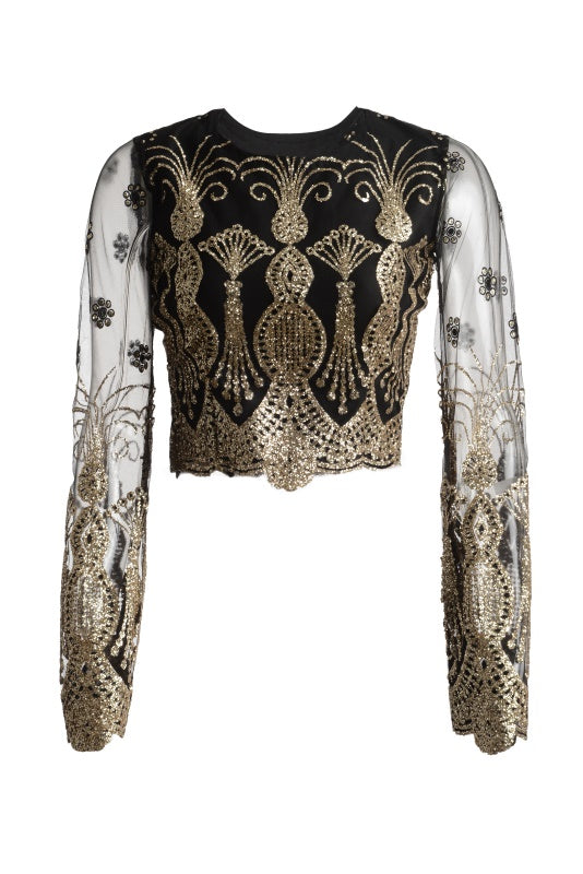 Long sleeve black top with gold sequin. The sleeves are sheer and body is lined. Zips up in the back.